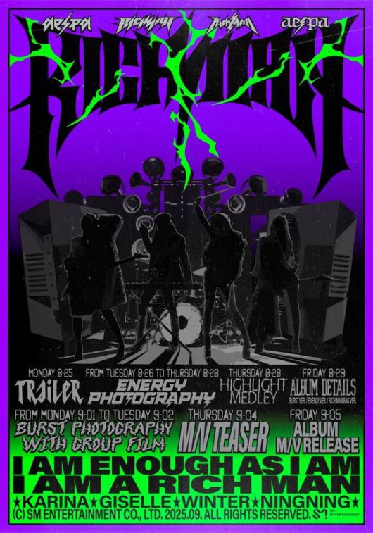 소속사 SM엔터테인먼트는 5일 에스파(카리나 윈터 닝닝 지젤) 공식 소셜 미디어에 이들의 미니 6집 'Rich Man(리치 맨)' 스케줄 포스터를 공개했다. 포스터는 각자 다른 악기를 들고 밴드 멤버로 변신한 네 멤버들의 실루엣과 함께 다채로운 콘텐츠를 예고했다.