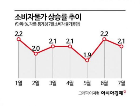 통계청이 5일 발표한 '7월 소비자물가동향'을 보면 지난달 소비자물가지수는 1년 전보다 2.1% 올라 전달(2.2%)보다 상승 폭이 소폭 둔화했다. 소비자물가지수 상승률은 지난해 7월 2.6%를 기록한 이후 계속 2%대 초반 이하에서 안정돼 있다. 올해는 1월부터 2%대를 기록하다가 지난 5월 1.9%로 떨어졌으나 6월부터는 두 달째 다시 2%대를 유지하고 있다.