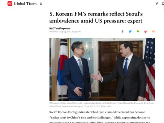 중국 관영매체도 조현 외교부 장관이 최근 미국 워싱턴포스트와의 인터뷰에서 "중국이 이웃 국가에 다소 문제가 되고 있다", "중국의 부상을 경계하게 됐다"는 취지의 발언을 한 것에 주목했다.