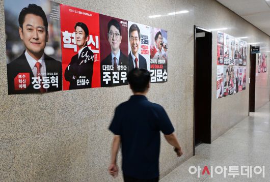 아시아투데이 이병화 기자 = 5일 국회 본청 복도에 국민의힘 당 대표 선거에 출마한 5명 후보의 포스터가 게시돼 있다.