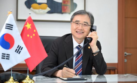 조현 외교부 장관이 지난달 28일 왕이 중국 외교부장과 취임 후 첫 전화 통화를 하고 있다. (사진=외교부) |