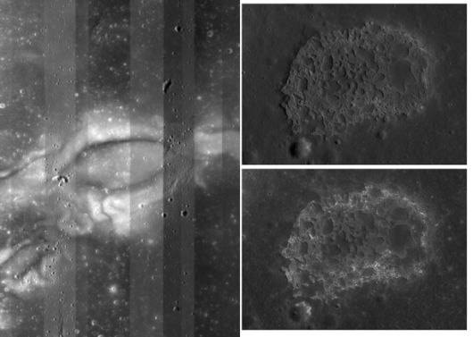다누리를 통해 찍은 달 자기이상지역 라이너감마(왼쪽), 달 표면 특이 지형 (Ina) 촬영 영상.(우주항공청 제공) |