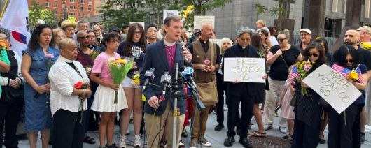 “억류 한인 유학생 석방을” 美뉴욕서 집회 2일(현지 시간) 미국 뉴욕 맨해튼 이민세관단속국(ICE) 청사 앞에서 성공회 뉴욕 교구 매슈 헤이드 주교(가운데)가 최근 ICE에 붙잡힌 한국인 대학생 고연수 씨의 석방을 요구하고 있다. 고 씨의 어머니는 성공회 사제인 김기리 신부다. 성공회 뉴욕 교구와 이민단체 등은 이날 도널드 트럼프 행정부의 이민자 단속이 과도하고, 부당한 구금 사례가 많다고 비판했다. 미주한인봉사교육단체협의회 제공 |