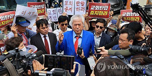 (서울=연합뉴스) 최재구 기자 = 경찰이 올해 1월 발생한 서울서부지법 폭력 난동 사태에 연관됐다는 의혹을 받는 전광훈 목사와 사랑제일교회에 대해 압수수색에 나선 5일 서울 성북구 사랑제일교회에서 나온 전광훈 목사가 발언하고 있다. 2025.8.5