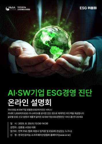 설명회에는 KOSA와 함께 진단서비스를 공동 개발하고 있는 ESG전문기업 i-ESG의 김종웅 대표가 최근 글로벌 ESG 동향과 함께 '2025 AI·SW기업 ESG경영 진단 서비스'에 대해 상세히 설명할 예정이다.