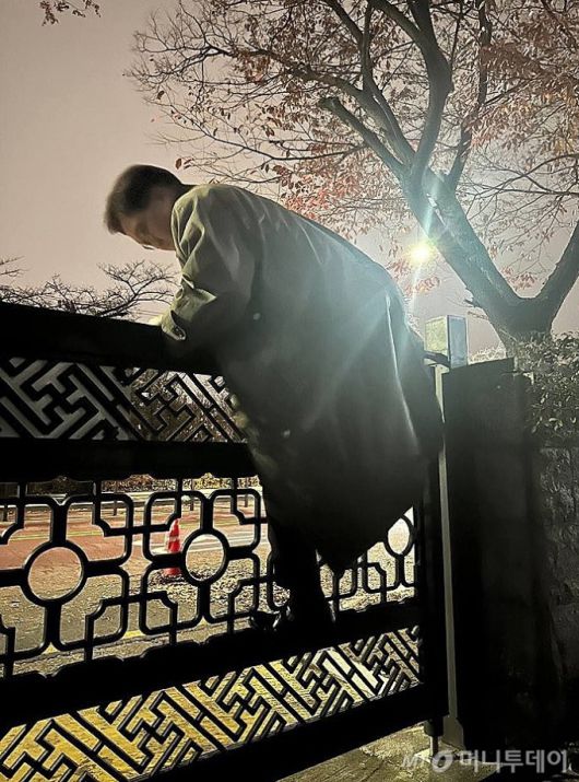 [서울=뉴시스] 조성우 기자 = 윤석열 대통령이 긴급 대국민 담화를 통해 비상계엄령을 발표한 지난 3일 오후 우원식 국회의장이 서울 여의도 국회 담장을 넘고 있다. (사진=국회의장실) 2024.12.04. photo@newsis.com *재판매 및 DB 금지 /사진= |