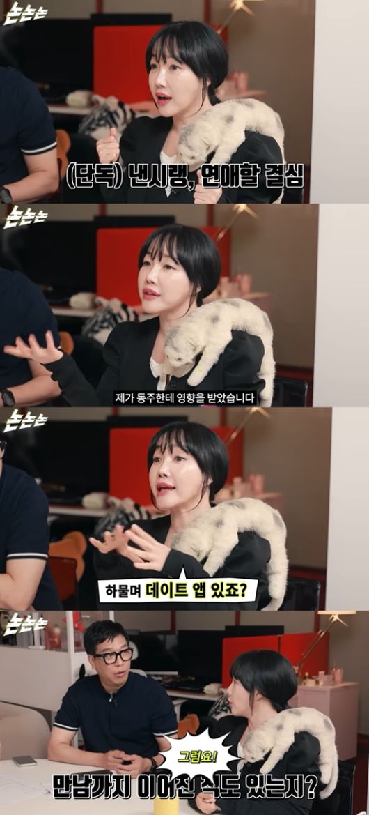 낸시랭은 "그래서 나도 그렇게 하고 있다. 용기를 내서 데이트 앱에도 올렸다. 엄청 노력을 했다. 연락이 많이 왔고, 데이트도 해봤다. 하도 사람들한테 소개팅 시켜달라고 하니까 친한 디렉터가 '내 주위는 다 결혼했다'라며 신분이 확실한 데이트앱을 알려줬다"라며 데이트 앱을 접하게 된 경위를 설명했다.