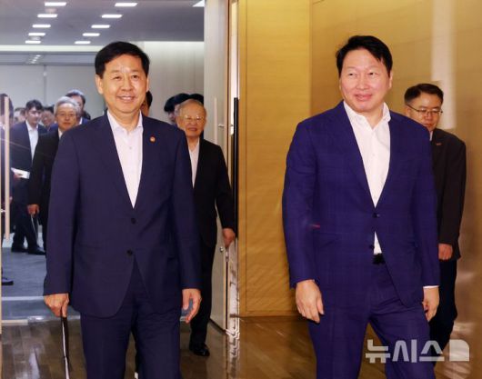 [서울=뉴시스] 황준선 기자 = 구윤철 경제부총리 겸 기획재정부 장관과 최태원 대한상공회의소 회장이 5일 오후 서울 중구 대한상공회의소에서 열린 '성장전략 TF 1차 회의'에 참석하고 있다. (공동취재) 2025.08.05. photo@newsis.com |