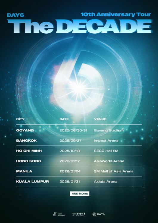 공개된 포스터에 따르면 데이식스는 이달 30~31일 양일간 고양을 시작으로 다음 달 27일(이하 현지시간) 방콕, 10월 18일 호찌민, 2026년 1월 17일 홍콩, 24일 마닐라, 31일 쿠알라룸푸르 등지에서 데뷔 10주년 기념 단독 콘서트를 열고 마이데이(팬덤명)와 만난다. 여기에 'AND MORE'라는 문구가 더해져 개최지 추가 발표에 대한 관심이 집중됐다.