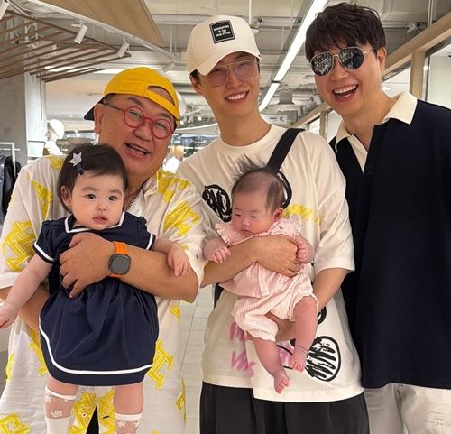 이용식은 노란 캡모자와 강렬한 패턴 셔츠를 매치하고, 첫 손녀 이엘을 품에 안은 채 환한 표정을 짓고 있었다. 옆에는 사위 원혁이 둘째 딸을 안고 밝은 미소를 지었다. 마주 선 박수홍과 아내 김다예는 손하트 포즈로 분위기를 더했다.