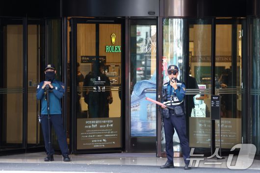 5일 오후 서울 신세계백화점 본점에서 한 인터넷 커뮤니티에 해당 백화점 내부에 폭발물을 설치했다는 협박글이 올라와 경찰특공대 등이 현장에 출동해 조사 중에 있다. 2025.8.5/뉴스1 ⓒ News1 김민지 기자 |