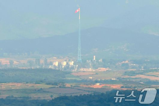 북한 황해북도 개풍군 기정동 마을에 대형 인공기가 휘날리고 있다. 2024.10.10/뉴스1 ⓒ News1 민경석 기자 |