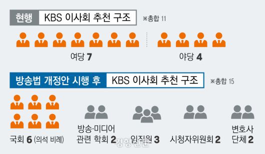 방송3법(방송법·방송문화진흥회법·한국교육방송공사법 개정안) 중 이날 우선 처리된 방송법 개정안은 한국방송(KBS)의 이사 수를 기존 11명에서 15명으로 늘리고, 추천 권한을 국회(6명)와 시청자위원회(2명), 임직원(3명), 방송미디어 관련 학회(2명), 변호사 단체(2명)로 확대한다. 또 사장후보국민추천위원회(사추위)를 설치하고 보도책임자에 대한 임명동의제도 도입된다. KBS 사장은 사추위에서 복수의 후보자를 추천받아 재적 이사 5분의 3 이상의 찬성으로 뽑게 된다.