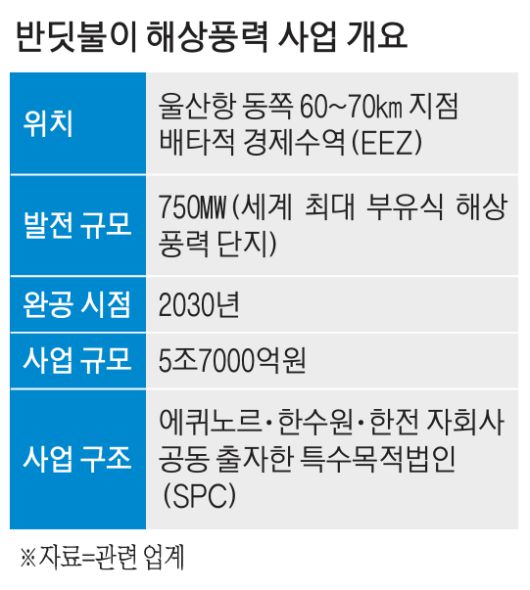 그러나 일각에서는 부유식 해상풍력 사업에 큰 위험이 따른다는 지적도 나온다. 부유식 해상풍력 발전은 계류선(풍력 터빈을 탑재한 부유체를 해저에 고정시키는 장치)과 부력으로 시설이 유지되기 때문에 고정식에 비해 불안정하고 파손 위험도 높다. 한 친환경 인프라 전문 자산운용사 관계자는 “부유식 해상풍력은 리스크가 커 민간 금융권에서는 잘 들여다보지 않는다”고 말했다.