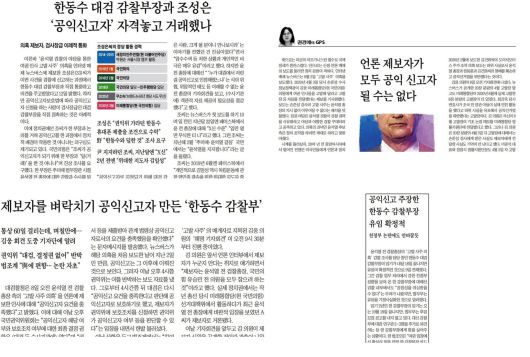 조선일보는 ‘고발사주’ 진상조사가 시작되자, 진상조사를 맡은 한동수 당시 대검 감찰부장의 수사가 편향될 수 있다는 내용으로 기사를 내기 시작했다. 시계방향대로 <한동수 대검 감찰부장과 조성은, ‘공익신고자’ 자격놓고 거래했나>(2021.9.13.), <언론 제보자가 모두 공익신고자 될 수는 없다>(2021.9.10.), <공익신고 주장한 한동수 감찰부장 유임 확정적>(2021.9.10.), <제보자를 벼락치기 공익신고자 만든 '한동수 감찰부'>(2021.9.9.) 순. (출처: 조선일보)