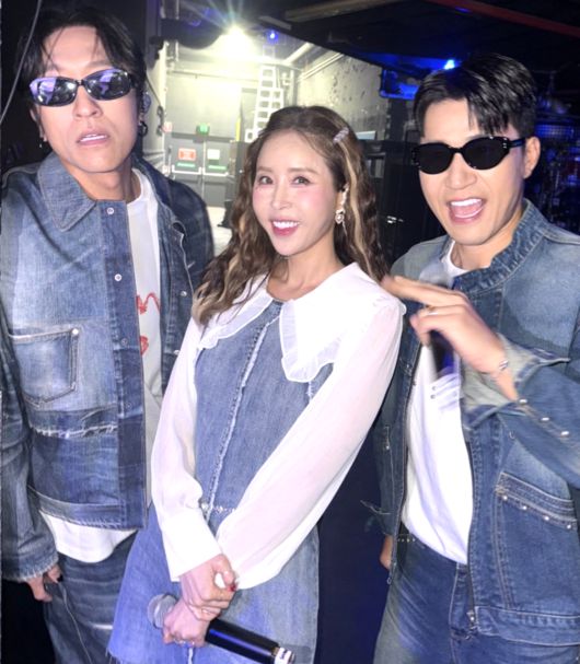 공개된 사진 속 신지는 코요태 멤버 김종민, 빽가와 함께 환한 미소를 짓고 있다. 세 사람은 모두 데님 스타일로 맞춰 입은 채 백스테이지에서 포즈를 취하고 있으며, 신지는 마이크를 손에 든 채 공연을 앞둔 설렘 가득한 모습을 보이고 있다.