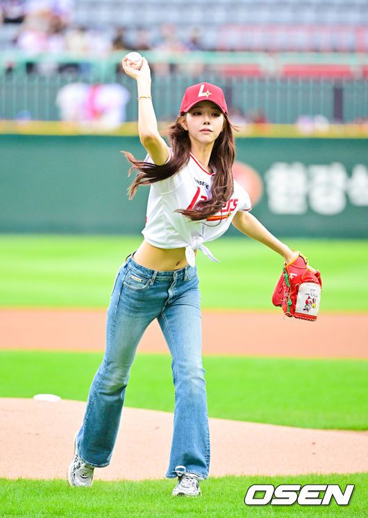 [OSEN=문학,박준형 기자] 5일 오후 인천 문학 SSG 랜더스 필드에서 ‘2025 신한 SOL BANK KBO리그’ SSG 랜더스와 삼성 라이온즈의 경기가 진행됐다. 이날 SSG은 문승원을, 삼성은 최원태를 선발투수로 내세웠다. 경기 앞서 모델 김혜진이 시구를 하고 있다 2025.08.05 / soul1014@osen.co.kr