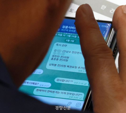 송언석 국민의힘 비상대책위원장 겸 원내대표가 지난 4일 강훈식 대통령실 비서실장에게 텔레그램 메시지로 광복절 특별사면 대상을 요청하고 있는 모습. 이데일리 제공
