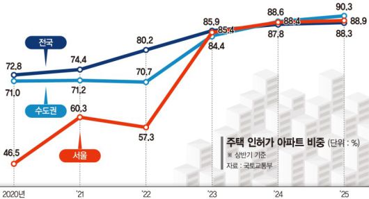 5일 파이낸셜뉴스가 2020~2025년 상반기 주택 유형별 인허가 실적을 분석한 결과 올 1~6월 아파트 비중이 전국 88.3%, 수도권 90.3%, 서울 88.9% 등으로 나타났다. 지역 가릴 것 없이 인허가 주택 10채 중 9채 가량이 아파트로 채워지고 있는 것이다.