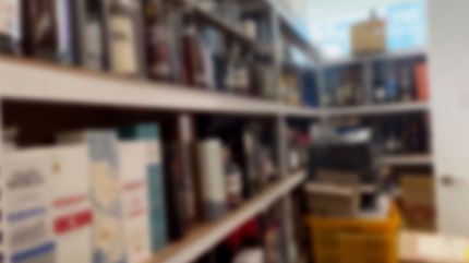 병원 창고 선반에 위스키가 한가득 쌓여 있습니다.