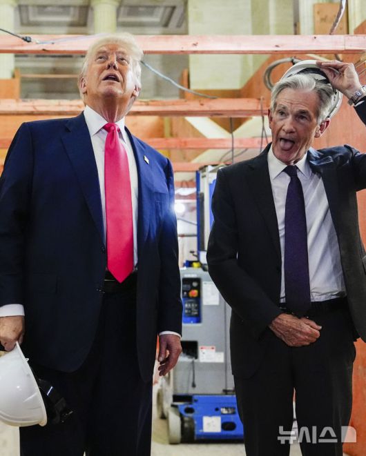 [워싱턴=AP/뉴시스] 월스트리트저널, 파이낸셜타임스에 따르면 트럼프 대통령은 5일(현지 시간) CNBC와의 인터뷰에서 "나는 스콧을 좋아하지만, 그는 지금 있는 자리에 머물고 싶어 한다"며 그를 후보군에서 제외하겠다고 말했다. 사진은 도널드 트럼프(왼쪽) 미국 대통령이 24일(현지 시간) 워싱턴DC 연방준비제도(연준) 건물 개보수 현장을 방문해 제롬 파월 의장과 함께 둘러보고 있다. 2025.08.05.