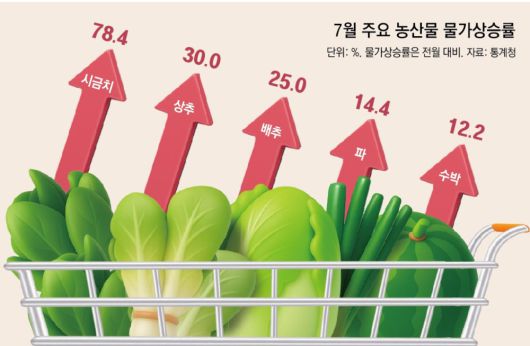 더위에 취약한 시금치 가격은 전월보다 78.4%나 올랐다. 상추와 배추 가격도 각각 30.0%, 25.0% 상승했다. 포도(28.8%), 수박(12.2%) 등 폭우에 쉽게 피해를 입는 과일을 중심으로 전월 대비 가격 상승률이 높았다. 박병선 통계청 물가동향과장은 “폭염 폭우의 영향으로 출하가 안 좋은데 수요가 큰 폭으로 늘면서 수박 가격이 많이 올랐다”며 “채소·과실 물가가 작년에도 높았기 때문에 전년 동월에 비해선 상승 폭이 크지 않지만 전월에 비해선 상승 폭이 크다”고 말했다.
