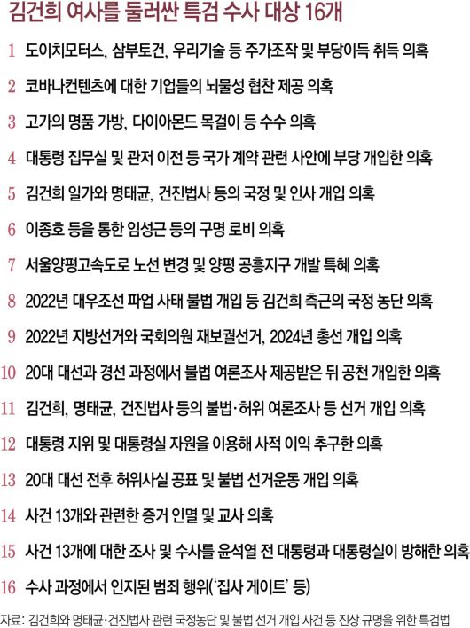 ‘역대 대통령 부인 첫 공개 조사’를 앞둔 김건희 특검팀(특별검사 민중기)은 총 16개 수사 대상의 ‘정점’으로 지목된 김건희 여사를 6일 불러 조사하면서 각종 의혹의 실체를 규명하겠다는 방침이다. 특검은 그물망처럼 얽히고설킨 ‘키맨’들에 대한 수사를 통해 확보한 진술과 증거를 토대로 김 여사의 답변을 끌어내 마지막 퍼즐을 맞춘다는 계획이다. 김 여사 측은 진술거부권을 행사하지 않는 등 조사에는 협조하겠다는 방침이지만 자신을 둘러싼 혐의에 대해선 전면 부인할 것으로 알려졌다.