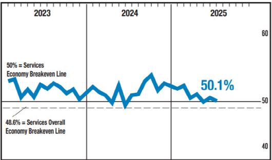 공급관리협회(ISM)에 따르면 7월 서비스업 구매관리자지수(PMI)가 50.1로, 전월(50.8)보다 하락했다. 시장 전망치(51.5)를 밑돈 수치로, 기준선인 50에 근접해 사실상 성장이 정체된 것으로 나타났다. 서비스업은 미국 국내총생산(GDP)의 약 3분의 2를 차지한다.