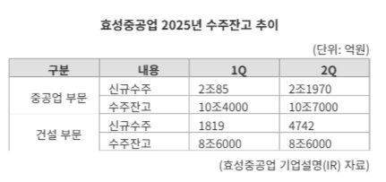 6일 업계에 따르면 효성중공업의 올해 2·4분기 중공업 부문 신규 수주는 2조1970억원으로, 전분기(2조85억원) 대비 9.4% 늘었다. 건설 부문 수주도 1819억원에서 4742억원으로 161% 급증했다.
