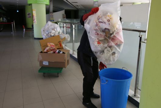 전북 전주시 완산구 전주대 진리관에서 청소노동자 들이 깡통과 종이 등 교내에서 수거한 재활용품을 정리하고 있다. 전주/류우종 기자 wjryu@hani.co.kr