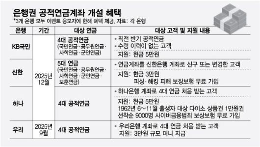 5일 금융권에 따르면 KB국민·신한·하나·우리은행은 공적연금을 처음 수령하는 고객을 대상으로 현금 지급 이벤트를 연말까지 진행한다.