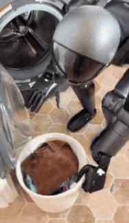 # 한 손에 빨래통을 든 휴머노이드 로봇이 세탁기 문을 열고 빨랫감을 하나씩 넣기 시작했다. 사람이 다가와 옷을 통에 넣자, 로봇은 자연스럽게 빨랫감을 건네받았다. 세탁기 밖으로 삐져나온 옷은 얼른 집어 들어 안 쪽으로 밀어 넣는다.
