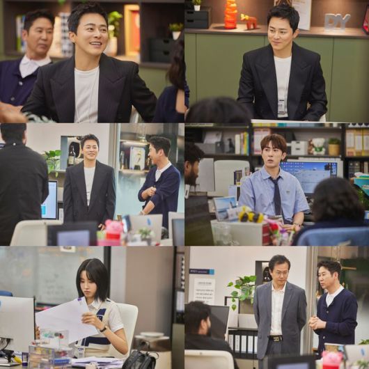 또 다른 스틸에는 신동엽 대표 이하 DY기획 임직원들의 기립 환대 속 긴장이 풀린 듯 환한 미소를 띠고 있는 모습부터 건치를 개방하며 활짝 웃는 모습, 직원들이 제시한 솔루션을 진지하게 경청 중인 표정까지 조정석의 다채로운 모먼트들이 담겨 있다. DY기획 직원들도 제각각 할 일에 집중하는 모습도 눈길을 끈다.