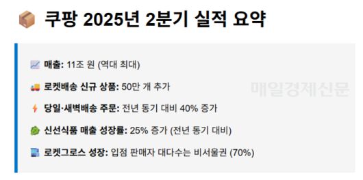 쿠팡이 올해 2분기 11조원대 매출을 올렸다. 역대 최대 분기 매출이다. 2분기에만 로켓배송 신규제품으로 50만개를 추가한 쿠팡은 당일·새벽배송 주문 물량이 전년 동기 대비 40% 이상 늘었다. 쿠팡이 자체 물류 시스템을 통해 상품을 빠르게 배송하는 로켓배송은 익일배송은 기본, 새벽배송과 당일배송을 앞세우고 있다.