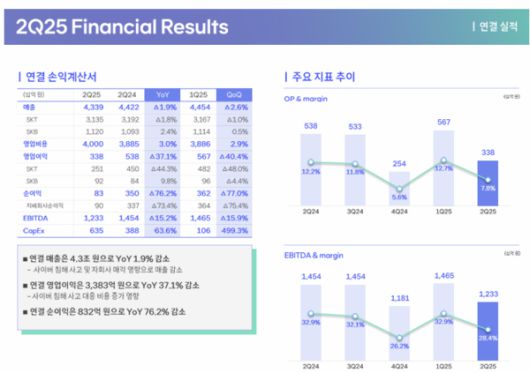 SK텔레콤이 2025년 2분기 실적을 공개했다. 예상대로 부진했다. 지난 4월 발생한 해킹 여파다. 고객 이탈 영업정지 가입자식별모듈(USIM, 유심) 교체 대리점 보상 등 비용을 2분기에 털었다.