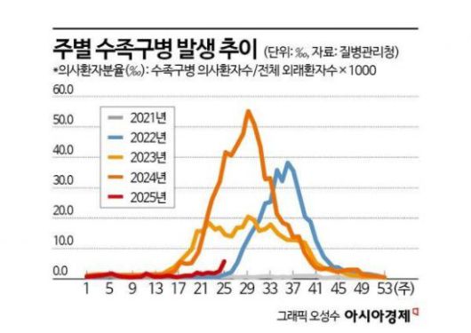 연도별 주간 수족구병 의사환자 분율 변화. 2025년 들어 환자 발생이 빠르게 증가하고 있으며, 특히 6월 셋째 주 이후 급증세를 보이고 있다. |