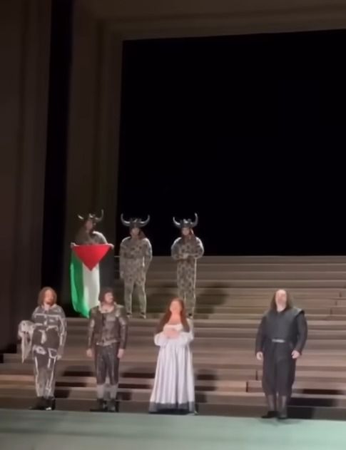 RBO의 한 무용수가 지난달 '라 트라비아타' 공연 커튼콜에서 팔레스타인 국기를 들어 올리고 있다. (사진 유튜브 사용자 @Newsglobalscope 캡쳐) |