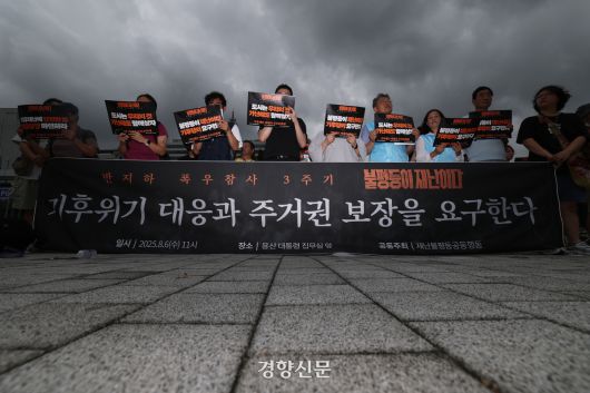 반지하 폭우참사 3주기 추모행동은 6일 서울 용산구 대통령실 앞에서 기자회견을 열고 “올해도 산불과 폭우 등 기후재난 피해가 극심했다”며 “기후 재난이 우리 모두의 삶을 위협하며 3년 전 반지하 폭우 참사 희생자를 추모했던 ‘불평등이 재난이다’라는 절규가 지금도 현실이 되고 있다”고 말했다.