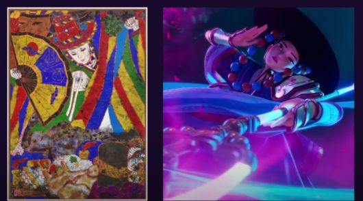 좌측부터 박생광 작가의 '무속화', 넷플릭스 애니메이션 영화 '케이팝 데몬 헌터스'. 베카 하딩 유튜브 캡처 |