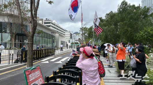 정문 한편에는 '정치한잔' 등 진보 성향 유튜버들을 중심으로 맞불 집회도 열렸다. 이곳에는 '명신아 감빵가자'고 적힌 깃발이 세워졌다.