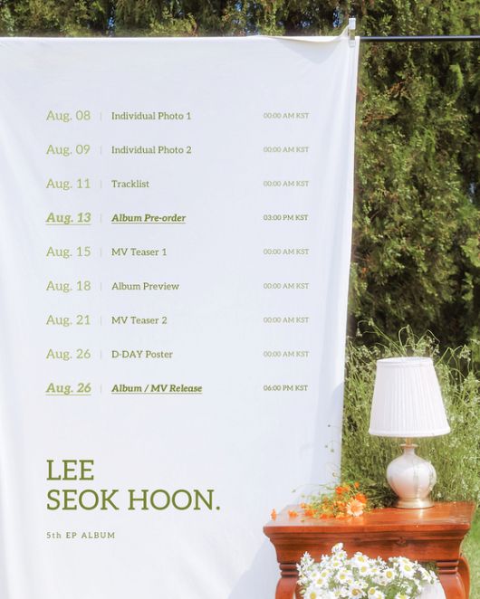 이석훈은 6일 자정 공식 SNS를 통해 다섯 번째 미니앨범의 타임테이블 이미지를 공개하며, 발매일시를 처음 오픈했다. 타임테이블에 따르면 이석훈은 26일 컴백 전까지 두 가지 버전의 개인 포토를 시작으로 트랙리스트, 뮤직비디오 티저 두 편, 앨범 프리뷰 등 티징 콘텐트를 차례로 공개한다. 13일 오후 3시부터는 각종 온라인 판매처를 통해 미니 5집 피지컬 앨범에 대한 예약 판매를 시작하며 컴백 열기를 더욱 높일 예정이다.