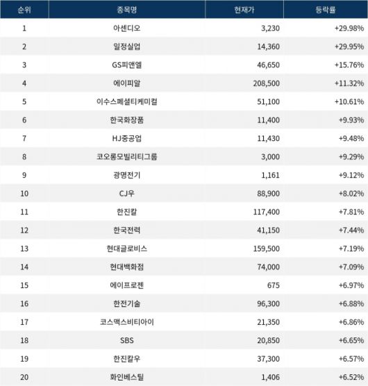 이밖에도 한진칼(180640) ▲7.81%, 한국전력(015760) ▲7.44%, 현대글로비스(086280) ▲7.19%, 현대백화점(069960) ▲7.09%, 에이프로젠(007460) ▲6.97%, 한전기술(052690) ▲6.88%, 코스맥스비티아이(044820) ▲6.86%, SBS(034120) ▲6.65%, 한진칼우(18064K) ▲6.57%, 화인베스틸(133820) ▲6.52% 등을 기록하며 금일 증시를 상승으로 마감했다.
