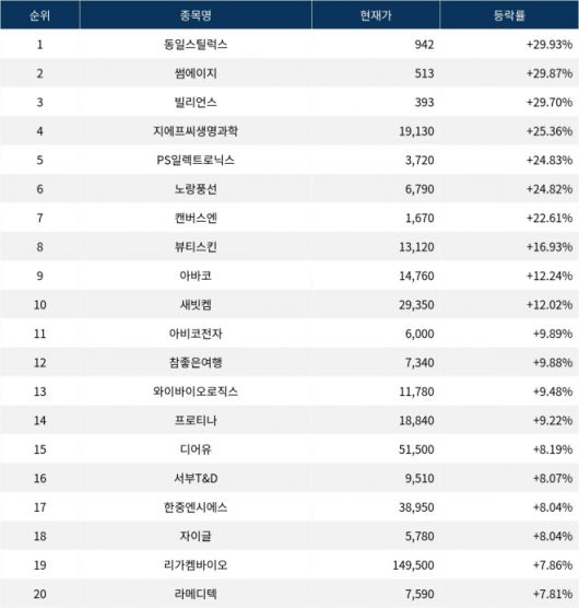 6위 노랑풍선(104620)은 종가 6,790원으로 24.82% 급등 마감했다. 7위 캔버스엔(210120)은 종가 1,670원으로 22.61% 급등 마감했다. 8위 뷰티스킨(406820)은 종가 13,120원으로 16.93% 급등 마감했다. 9위 아바코(083930)는 종가 14,760원으로 12.24% 급등 마감했다. 10위 새빗켐(107600)은 종가 29,350원으로 12.02% 급등 마감했다.