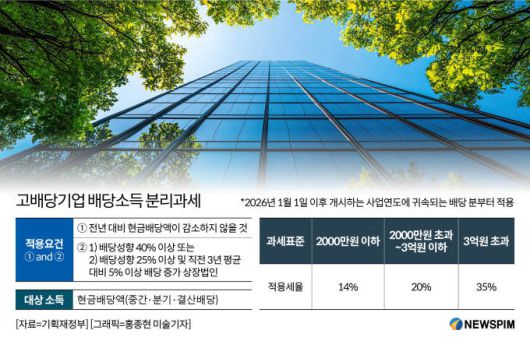앞서 정부가 발표한 올해 세제개편안에는 배당소득을 기존 근로소득이나 사업소득 등과 분리 과세해 낮은 세율을 적용하는 배당소득 분리과세 내용이 담겼다. 이자소득과 배당소득을 합한 금융소득이 연간 2000만원을 넘기면 누진세율에 따라 최고 49.5% 세율이 적용된다.