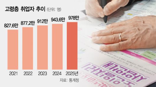 통계청이 6일 발표한 ‘경제활동인구조사 고령층 부가조사 결과’에 따르면 올해 5월 기준 고령층 취업자는 978만 명으로 2005년 관련 통계 작성 이래 최대치를 기록했다. 이는 전년 동월 대비 34만 4000명 증가한 수치다.
