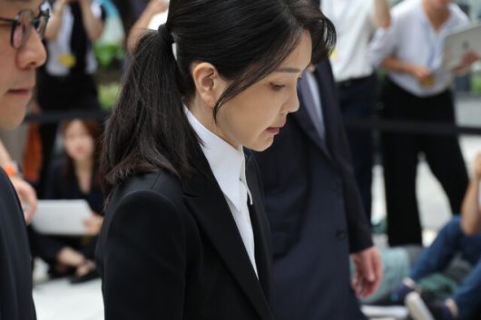 윤석열 전 대통령의 부인 김건희 여사가 6일 오전 서울 종로구 케이티(KT) 광화문빌딩 웨스트에 마련된 민중기 특별검사에 피의자 신분으로 소환되고 있다. 류우종기자 wjryu@hani.co.kr |
