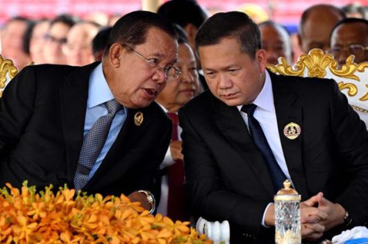 6월 캄보디아 프놈펜에서 열린 캄보디아인민당(CPP) 창립 74주년 기념식에서 훈센(왼쪽) 전 총리가 장남인 훈마넷 총리와 귓속말을 하고 있다. 프놈펜=AFP 연합뉴스 |