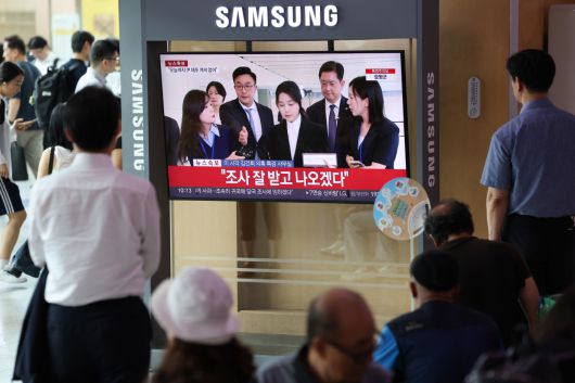 6일 서울역에서 시민들이 윤석열 전 대통령의 부인 김건희 여사가 각종 의혹 조사를 받기 위해 민중기 특별검사팀에 피의자 신분으로 출석하는 모습을 방송으로 보고 있다. /연합 |