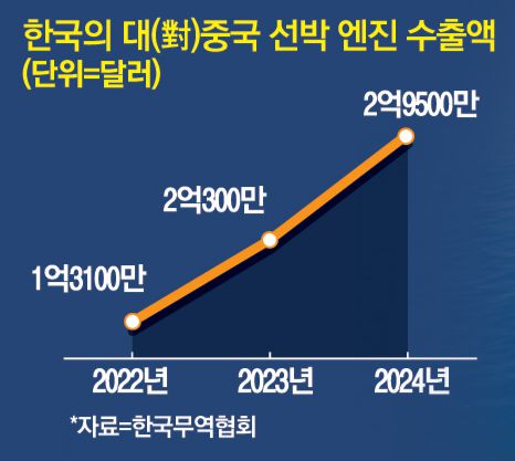 한국무역협회와 KOTRA 등에 따르면 한국의 대중 선박 엔진 수출은 2022년 1억3100만달러에서 지난해 2억9500만달러까지 2배 이상 급증했다. 올해도 1~5월 1억2700만달러에 달하는 선박 엔진을 중국에 수출했다. 중국의 선박 엔진 수입에서 한국은 점유율 1위를 차지하고 있다.
