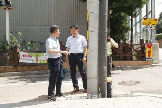 [이데일리 김태형 기자] 이기재(왼쪽 두번째) 양천구청장이 5일 차량 통행에 불편을 초래하던 신월6동 남부순환로 609 앞 지장 전신주 이설현장에서 관계자와 대화를 하고 있다.